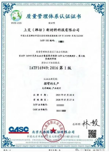 上交(濰坊)新材料公司成功取得IATF16949質量管理體系認證證書